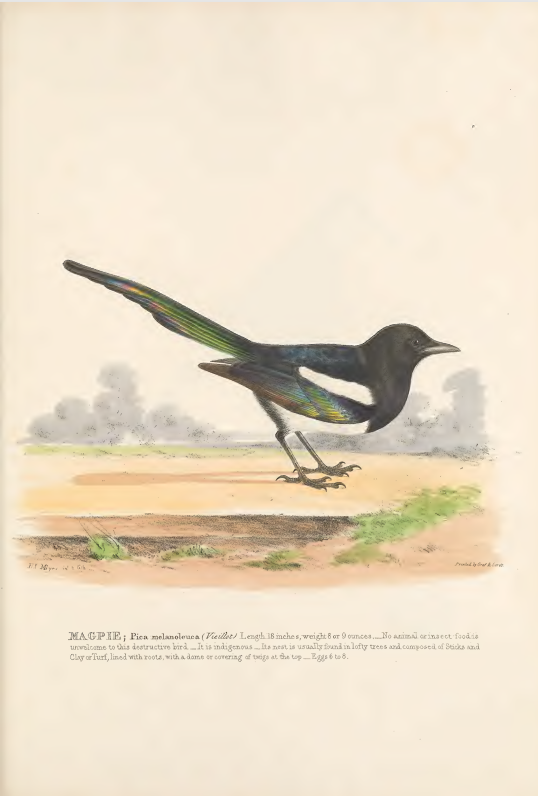 Meyer’s illustration emphasises the green, Gould has more of both colours, but as with Gould’s Peregrine Falcon, the head shape doesn’t look quite right to me. Meyer has the species as Pica melanleuca, Gould Pica caudata. Clearly I have a very great deal to learn about the evolution of and changes to these scientific names. Collins Bird Guide gives today’s Pica pica. Linnaeus gave us Corvus pica but the bird was moved to a separate genus, Pica, in 1760 by French zoologist Maturin Jacques Brisson. Neither Gould nor Meyer seem to have been aware of this which just adds to my confusion over this subject. Pica pica is the Common or Eurasian Magpie. The North American Black-billed Magpie was thought to be conspecific but this was changed in 2000 by the American Ornithologists’ Union, who accorded it separate species status. There is no one firm consensus about the many subspecies. The Yellow-billed Magpie is treated as a separate species however.